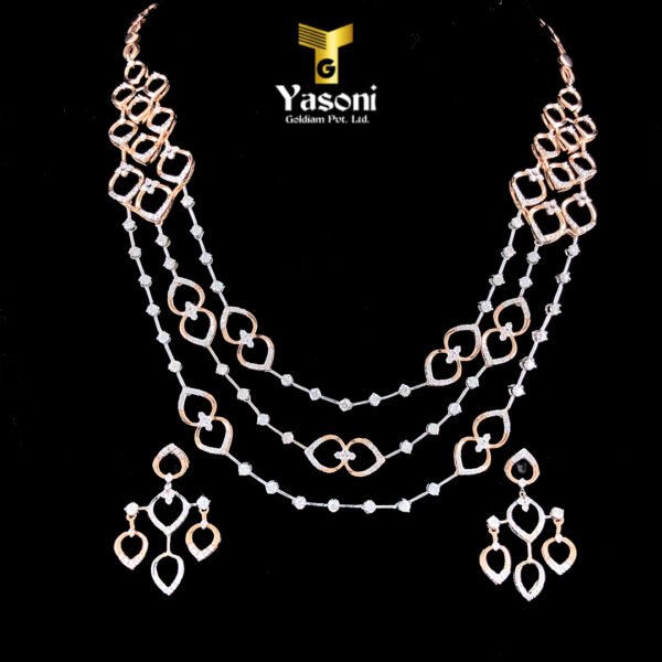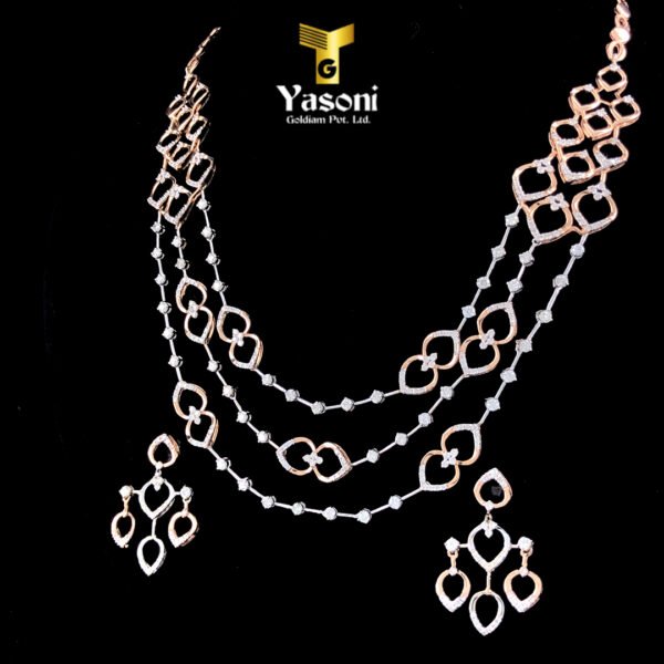 “The 3-Line Diamond Necklace is a stunning piece that features three parallel rows of dazzling diamonds set in precious metal rose gold. This design creates an effect of maximum sparkle, brilliance, and volume, making it a bold, glamorous choice, often for formal events, bridal wear, or special occasions