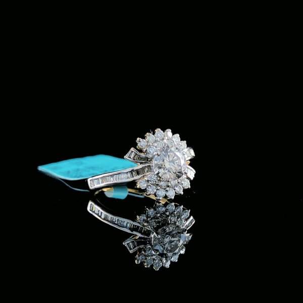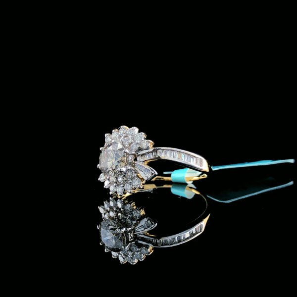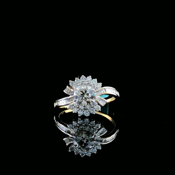This magnificent ring commands attention with a single, generously sized center diamond, embodying regal elegance. The setting features a smooth, highly polished shank (band) that reflects light like a mirror, creating a brilliant contrast that makes the central stone appear even larger and more dazzling.