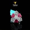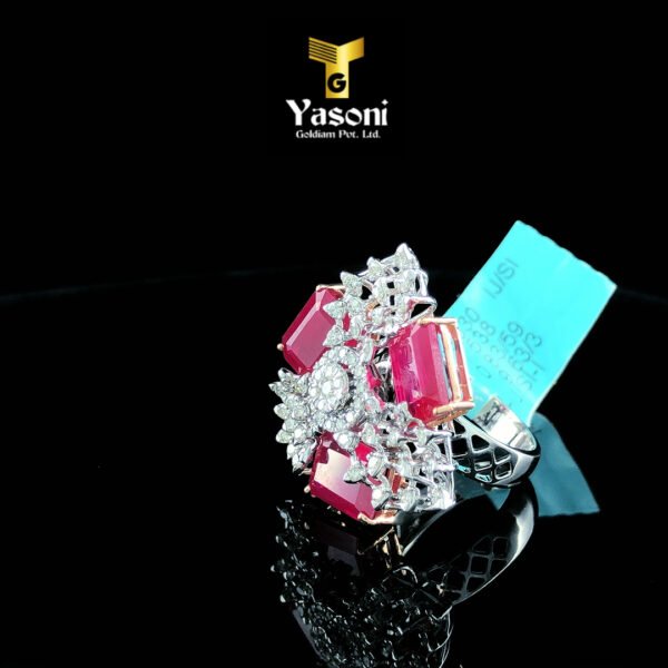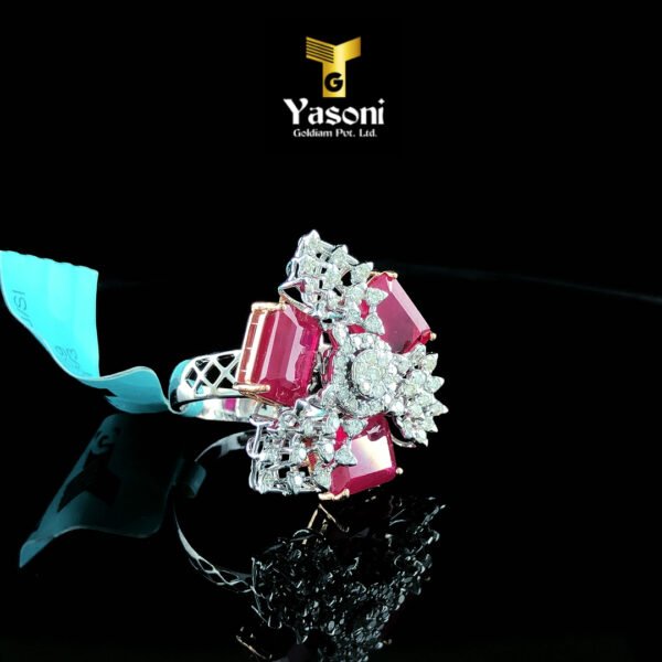 💖Dazzling cocktail ring featuring a bold design with three prominent, vibrant red gemstones (likely ruby or simulated stones). It’s intricately detailed with brilliant-cut diamond accents in a delicate, ornate setting, making it a true statement accessory! ✨💍