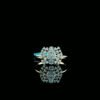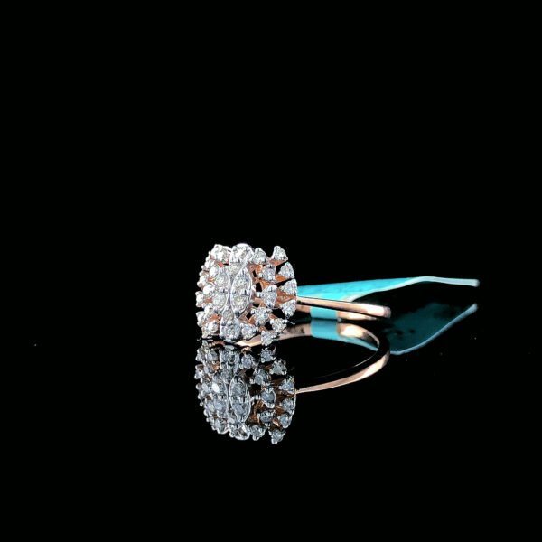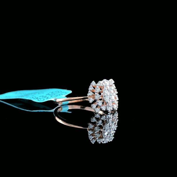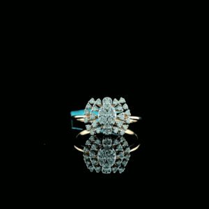 A Unique Diamond Cluster Ring. It features a non-traditional, asymmetric cluster of multiple smaller round diamonds set closely together to create a large, sparkling focal point. The stones are secured with fine prongs, and the ring has a split-shank band that tapers toward the top, giving it a modern and delicate look.